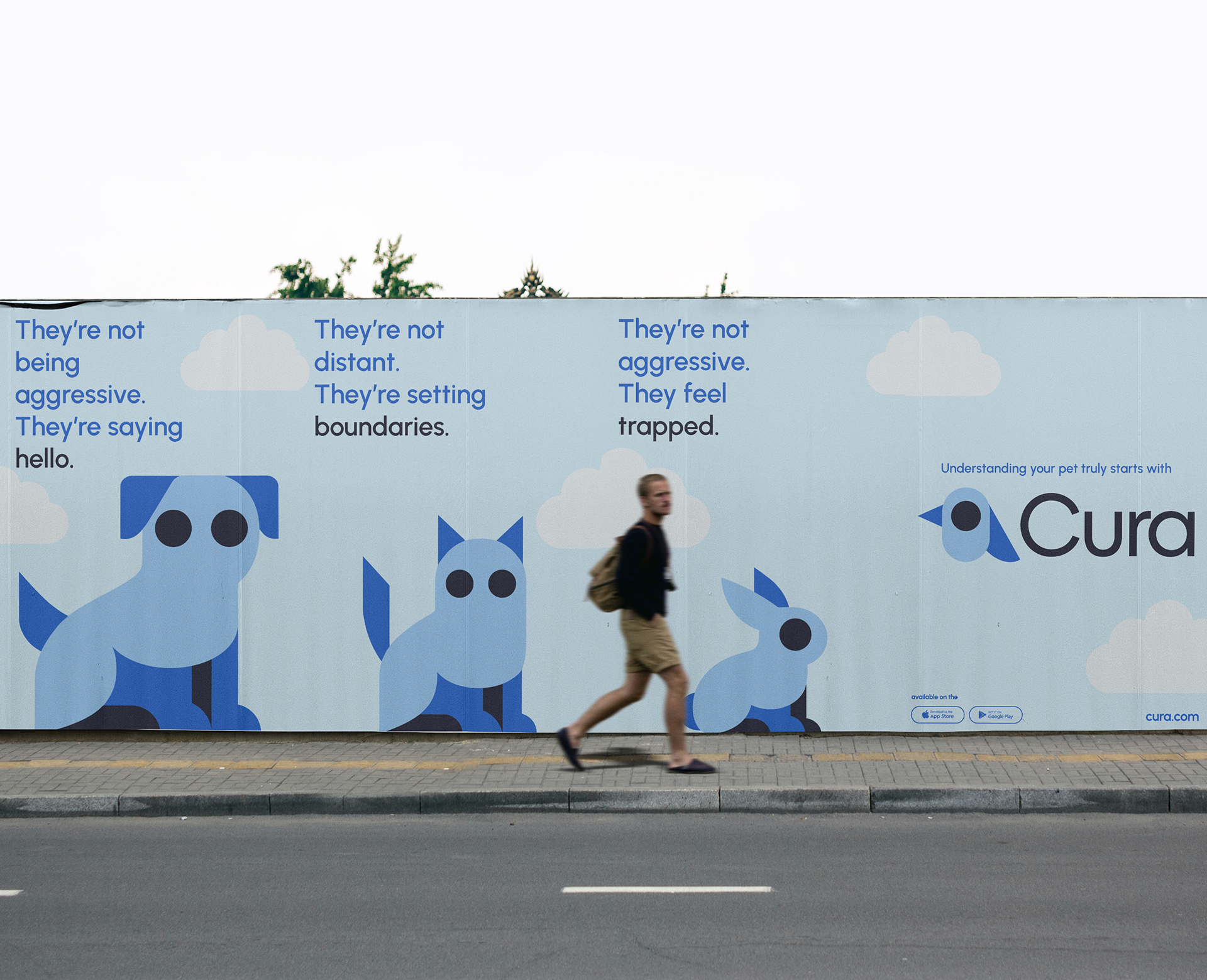 Cura is an AI-based app designed to help people better understand how pets communicate. Instead of framing animal actions as “behavior problems,” Cura reframes them as signals — expressions of emotion, boundaries, and intent that are often misunderstood through a human lens. The branding is built around clarity and empathy. The visual language avoids exaggeration or cuteness and instead uses simplified forms, soft geometry, and a restrained color palette to reduce noise and judgment. The animals are illustrated in a minimal, almost symbolic way, allowing their posture and presence to carry meaning without over-explaining. Typography and messaging are direct and calm, often reframing common assumptions with short, declarative statements. This mirrors the product’s role: not to overwhelm with information, but to gently shift perception and invite a more attentive way of looking. Cura’s branding positions the company as a mediator — sitting between human interpretation and animal reality — using design to make non-verbal communication feel accessible, respectful, and emotionally grounded.