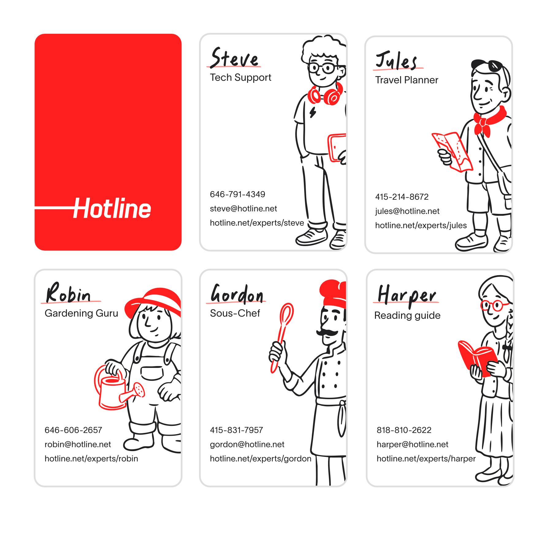 Hotline is a company that provides on-demand assistance across a wide range of fields through AI agents, each designed to act as a knowledgeable, approachable expert. As part of my work with Hotline, I was responsible for creating and refining their visual assets and helping tighten their overall design language. This included designing illustrated AI agent characters, developing a welcome box for new users, and shaping the physical items inside it—such as agent business cards, magnets, and supporting materials. The goal was to translate a complex AI-driven product into a warm, clear, and cohesive visual experience that builds trust and makes the technology feel accessible.