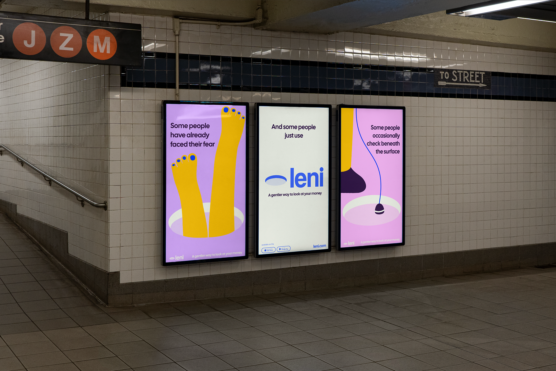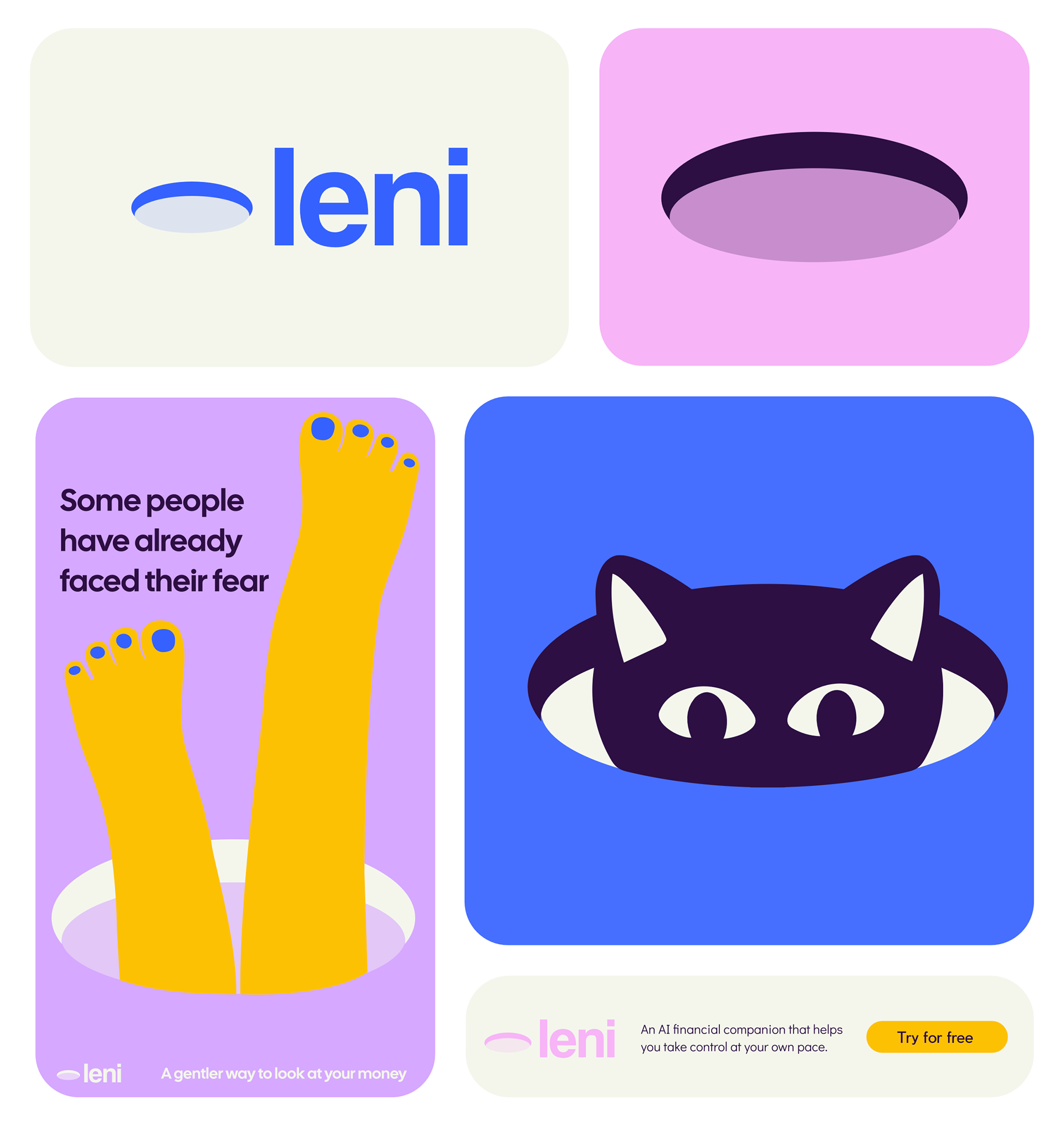 Brand Identity & Campaign System Leni is an AI-powered financial companion designed to help people look at their money without pressure or judgment. The identity is built around a simple metaphor: For many people, a bank account feels like a hole in the ground. Instead of treating it as something dark or dramatic, the brand reframes it as a neutral space one that people approach differently. Visual Language- The “hole” became the core graphic device of the system. It appears repeatedly across touchpoints sometimes as a static symbol, sometimes as an interactive space, and sometimes as a narrative element in the campaign. The illustration style is flat and bold:No texture,No gradients, No unnecessary detail, Clear geometric shapes and Strong contrast. Color Strategy- The palette balances emotional tension and safety. Vibrant yellow and purple and pink create energy and visibility. Deep blue anchor the brand in trust and stability. Soft neutrals create breathing space. Verbal Tone- The copy is observational and non-judgmental. Short, simple statements